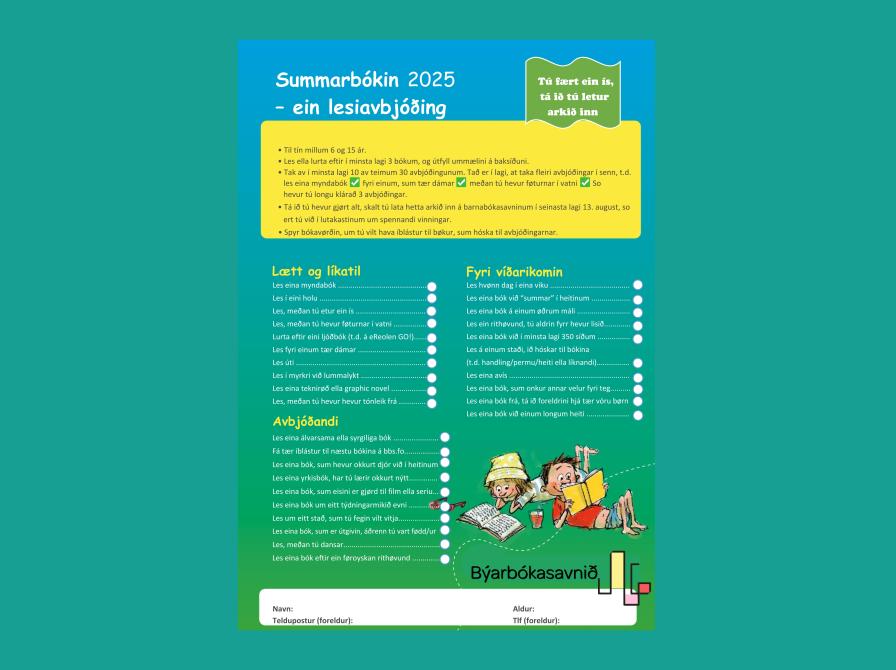 Fá eitt skjal á bókasavninum at fylla út. So skalt tú lesa 3 bøkur, klára 10 avbjóðingar, og skriva ummæli av bókunum.